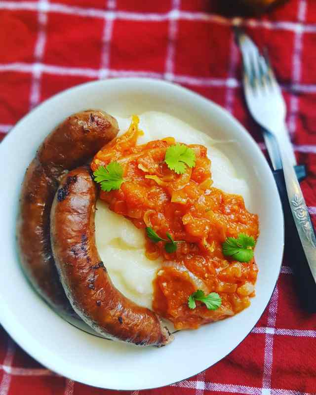 Spicy wors, buttery pap and a sweet tangy tomato gravy, an absolute classic South African Dish.