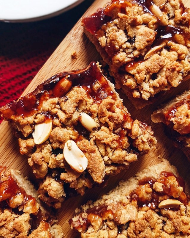 4. Spread ⅔ of the dough in the baking pan and use a knife to spread it evenly. Spread jam evenly over the dough. Drop small blobs of the remaining dough evenly over the jam. Sprinkle with chopped peanuts and bake for 45 minutes or until golden brown.