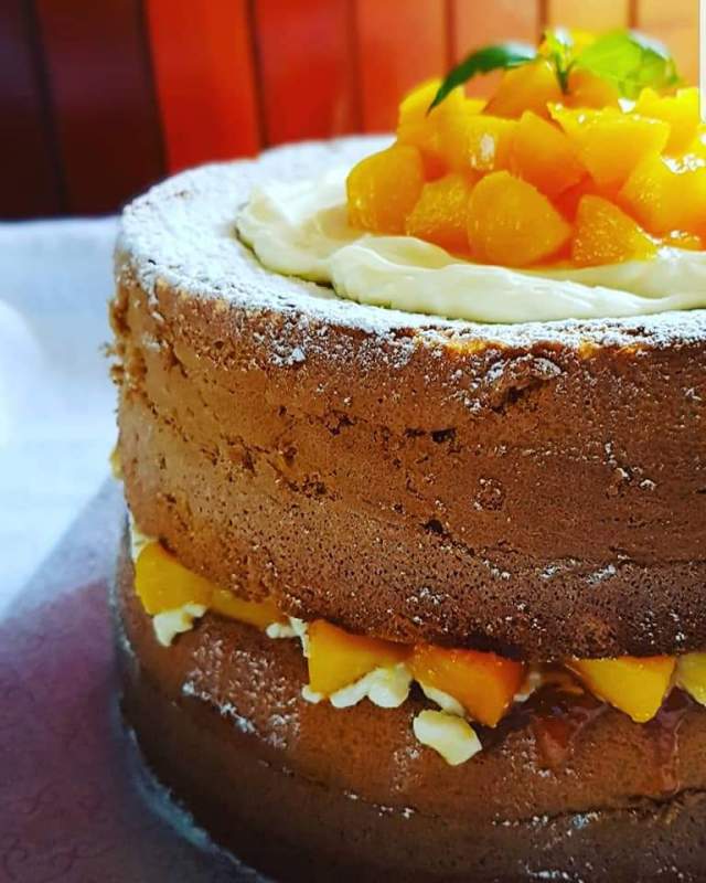 Place the other cake on top. Spread cream over the top, keeping the sides exposed, and decorate with the remaining peaches and enjoy!