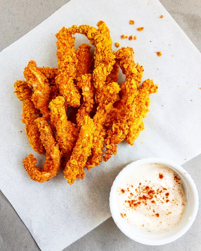2. Dip each strip in the egg mixture and then into the Doritos mixture making sure the entire strip is coated.