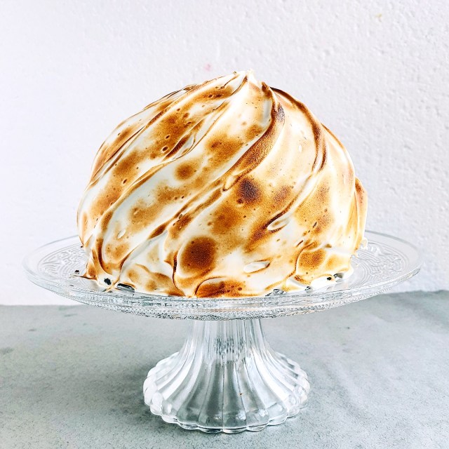 2. Spread meringue all over the ice cream, completely enclosing it. Use a spoon to create big peaks and swirls. Make sure there is absolutely no ice cream peeking out. If using the kitchen torch, toast the entire meringue topping. If using the oven, bake in preheated oven for 4-5 minutes until toasted.
