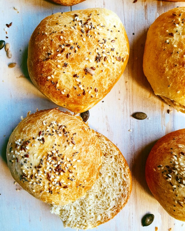 3. Gently deflate the dough, and divide it into 8 pieces. Shape each piece into a round ball. Place the buns on a lightly greased or baking paper lined baking sheet, cover, and let rise for about an hour, until puffy. Brush the buns with about half of the melted butter and top with seeds (optional).