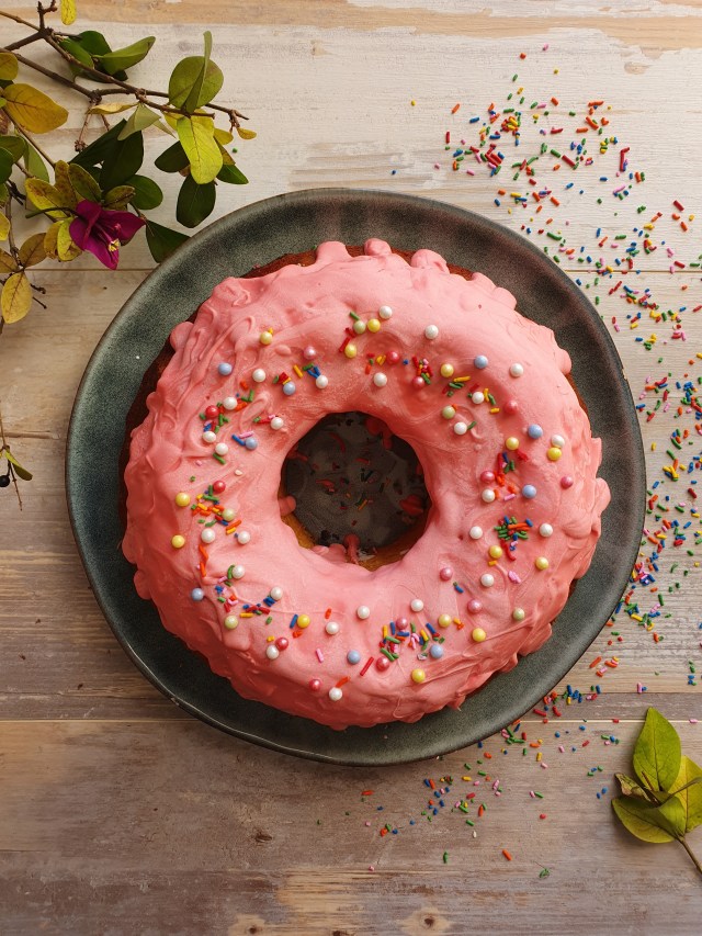 I like letting my ganache sit at room temperature to cool and thicken. It will fully cool within 2 hours, mix in food colouring powder and drizzle over your bundt, add sprinkles and serve.