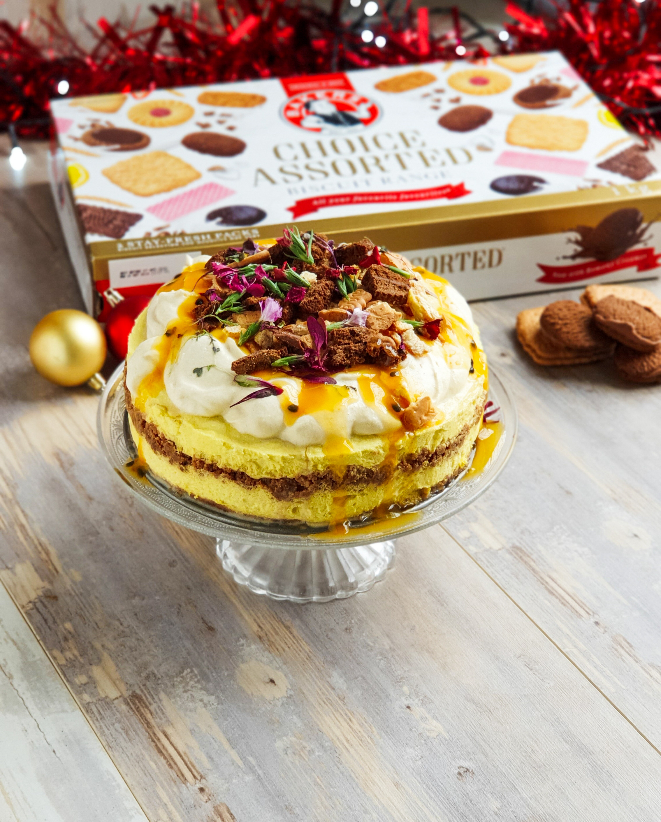 5. Refrigerate for 4 hours – overnight. Before serving top with whipped cream, passionfruit pulp and Bakers Lemon Creams® and Romany Creams®biscuits.