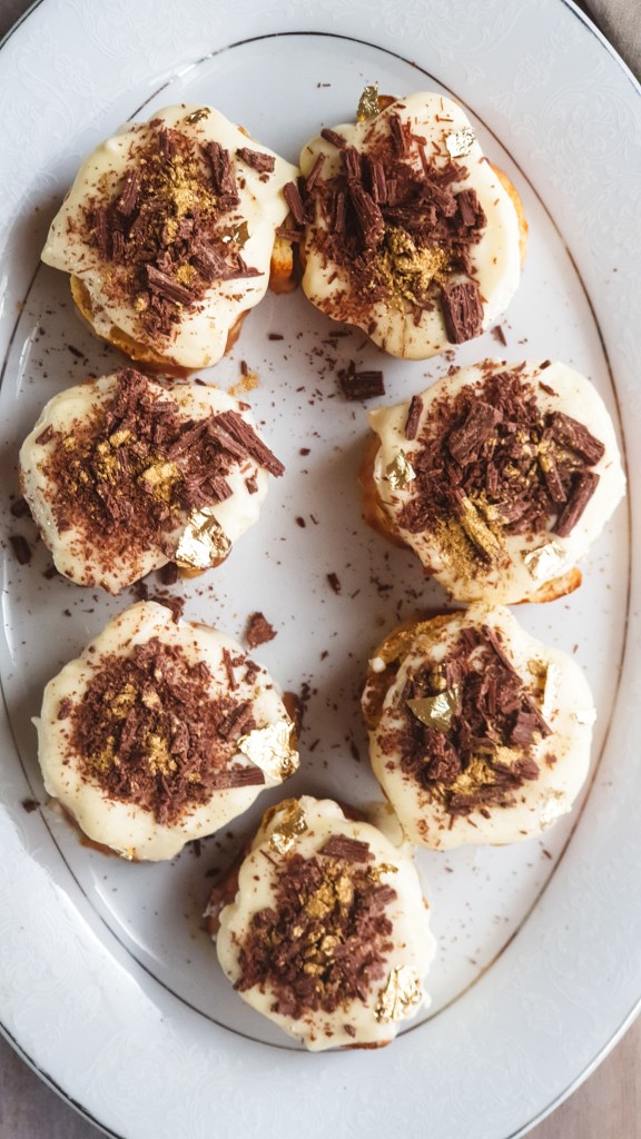 I filled mine with whipped fresh cream and salted caramel. Topped with white chocolate ganache and flaked chocolate and because its NYE I added some edible gold leaf and glitter.