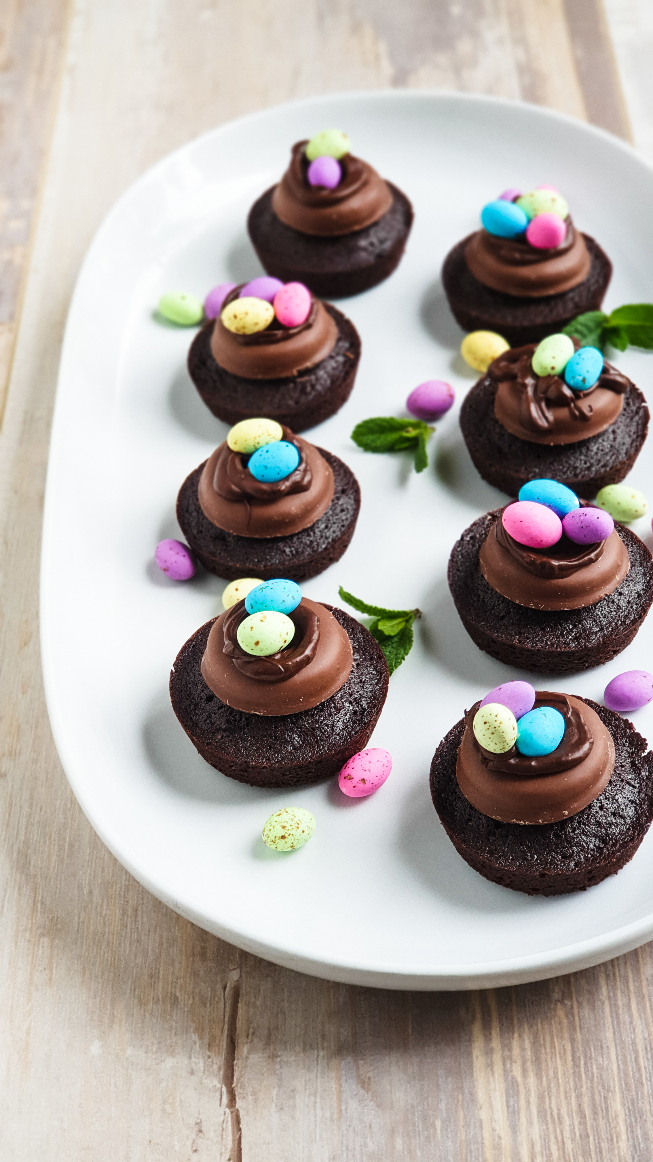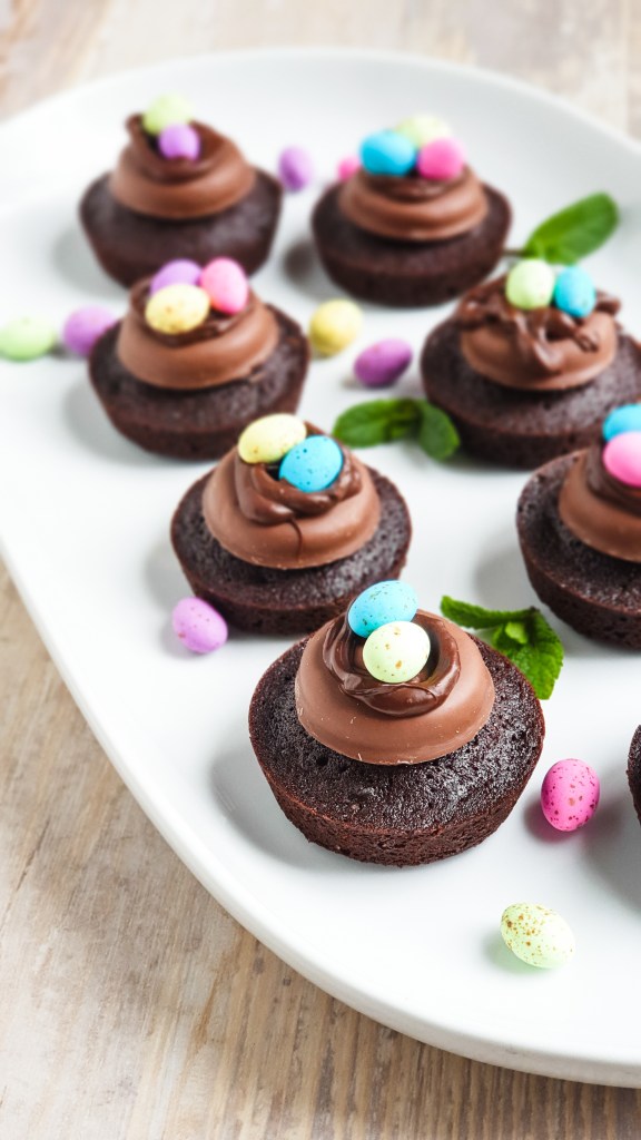 5. Once your brownies have cooled. Top each one with a Bakers Choc-o-Break biscuit, drizzled melted chocolate over and place speckled eggs on top.