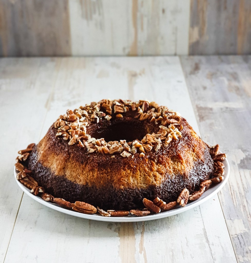 8. Top with extra caramel and pecans and serve warm or cold.