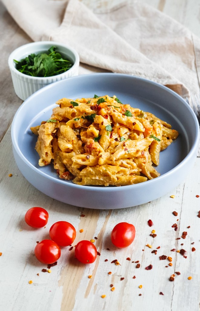 I like to chop up some coriander and stir that through as well for a lovely fresh flavour. Serve with a sprinkle of red chilli flakes