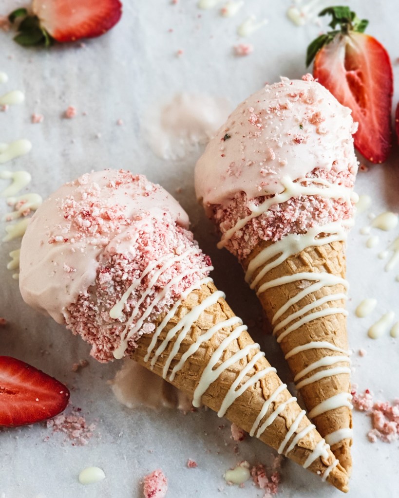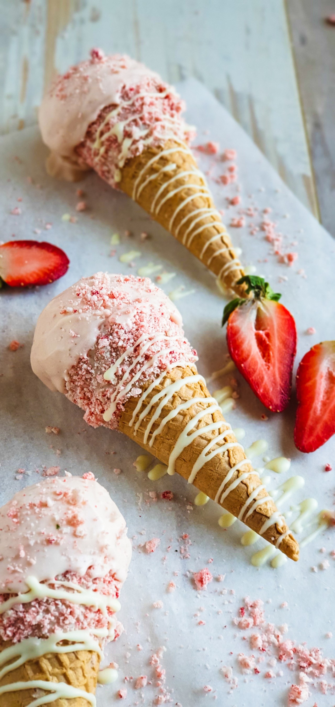 Strawberry and basil are one of my favourite flavour bomb combinations whether in the form of sorbet, cheesecake or ice cream. The cones are gorgeous and playful and a really great way to enjoy a scoop or two, just remember to line each cone with chocolate to prevent it from getting all soggy and grosse.