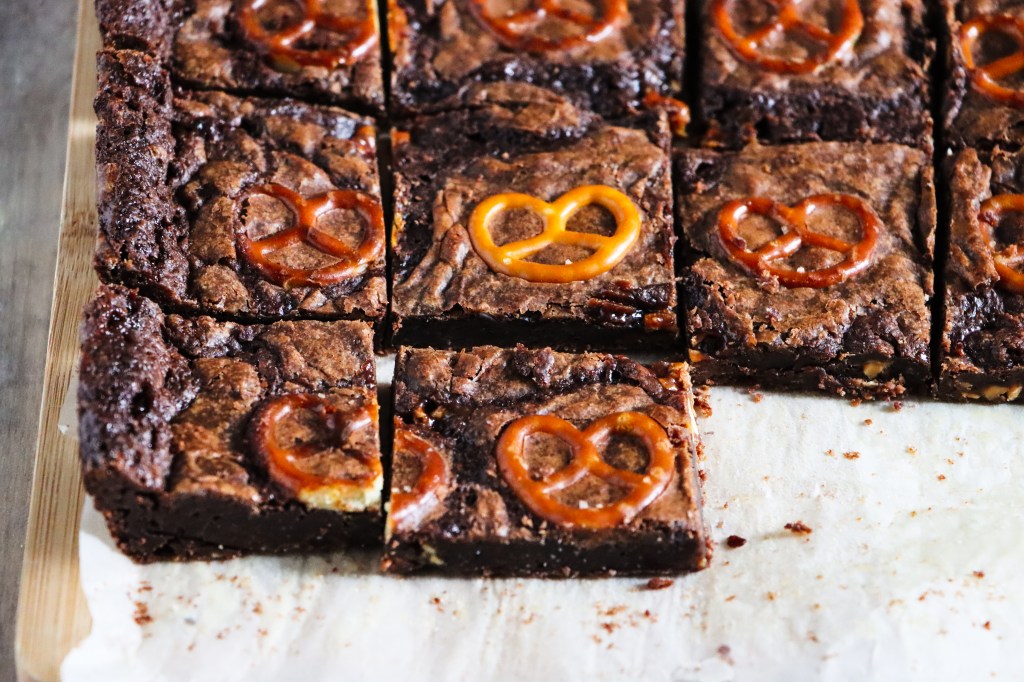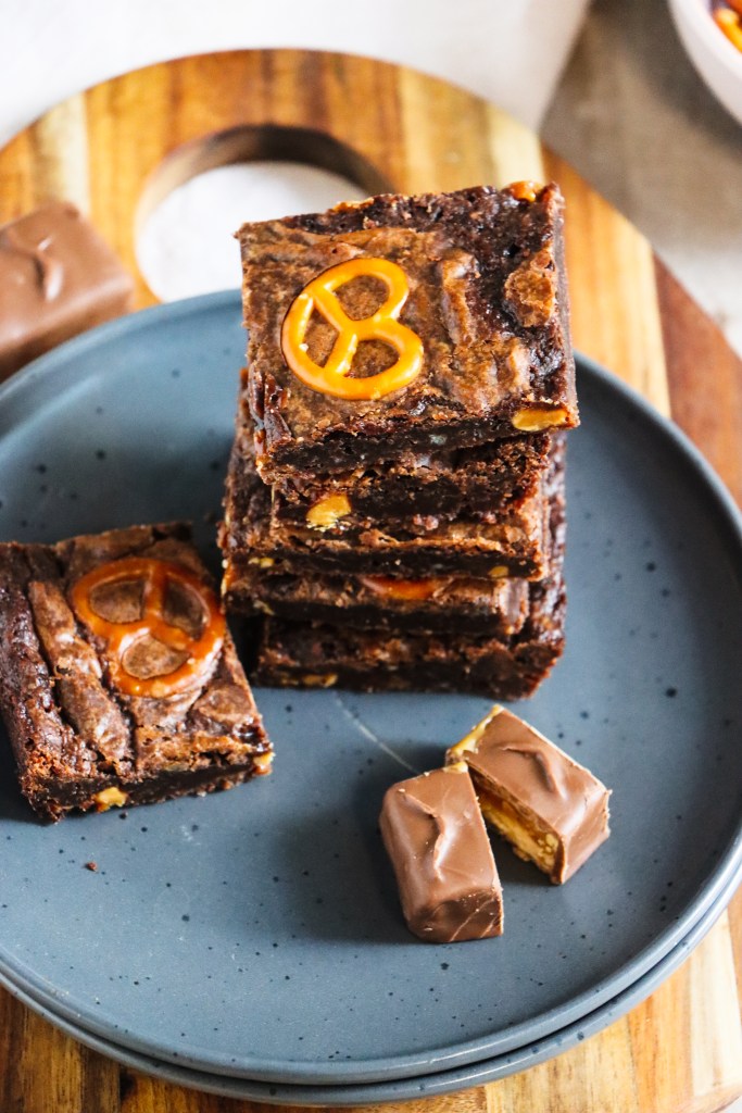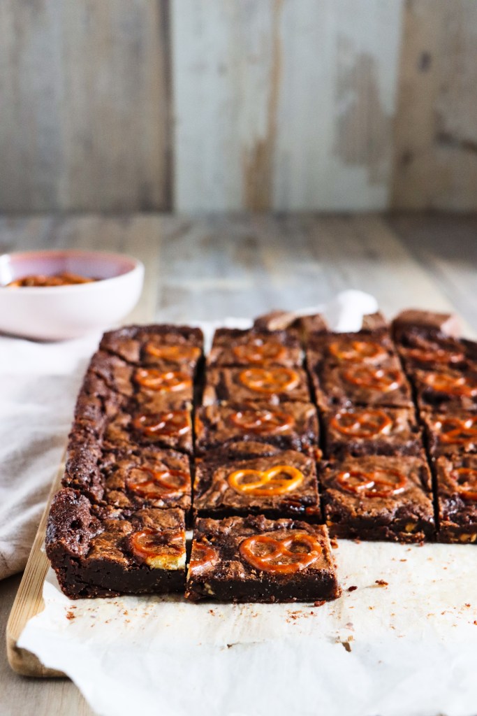 The addition of salted pretzels and snickers however managed to balance it out so beautifully. The sweet and salty flavour is such a great combination. The chunks of caramel and peanuts give the brownies a lovely texture too!
