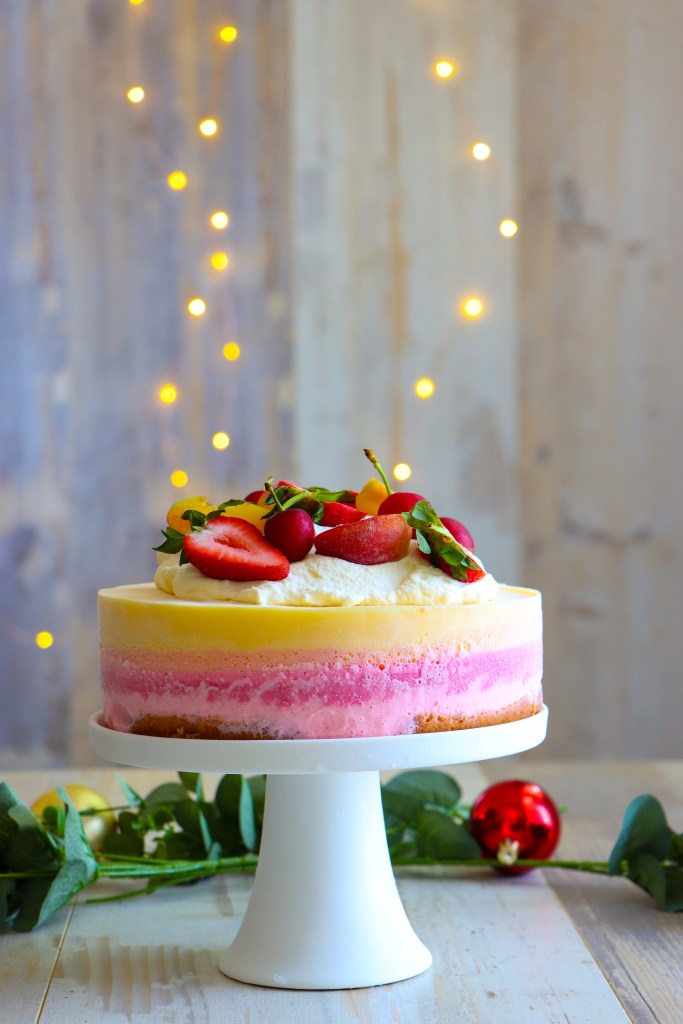 9 Before serving, whip fresh cream with icing sugar and vanilla essence until stiff peaks form. Dollop the cream over the cake and decorate with fresh fruit.