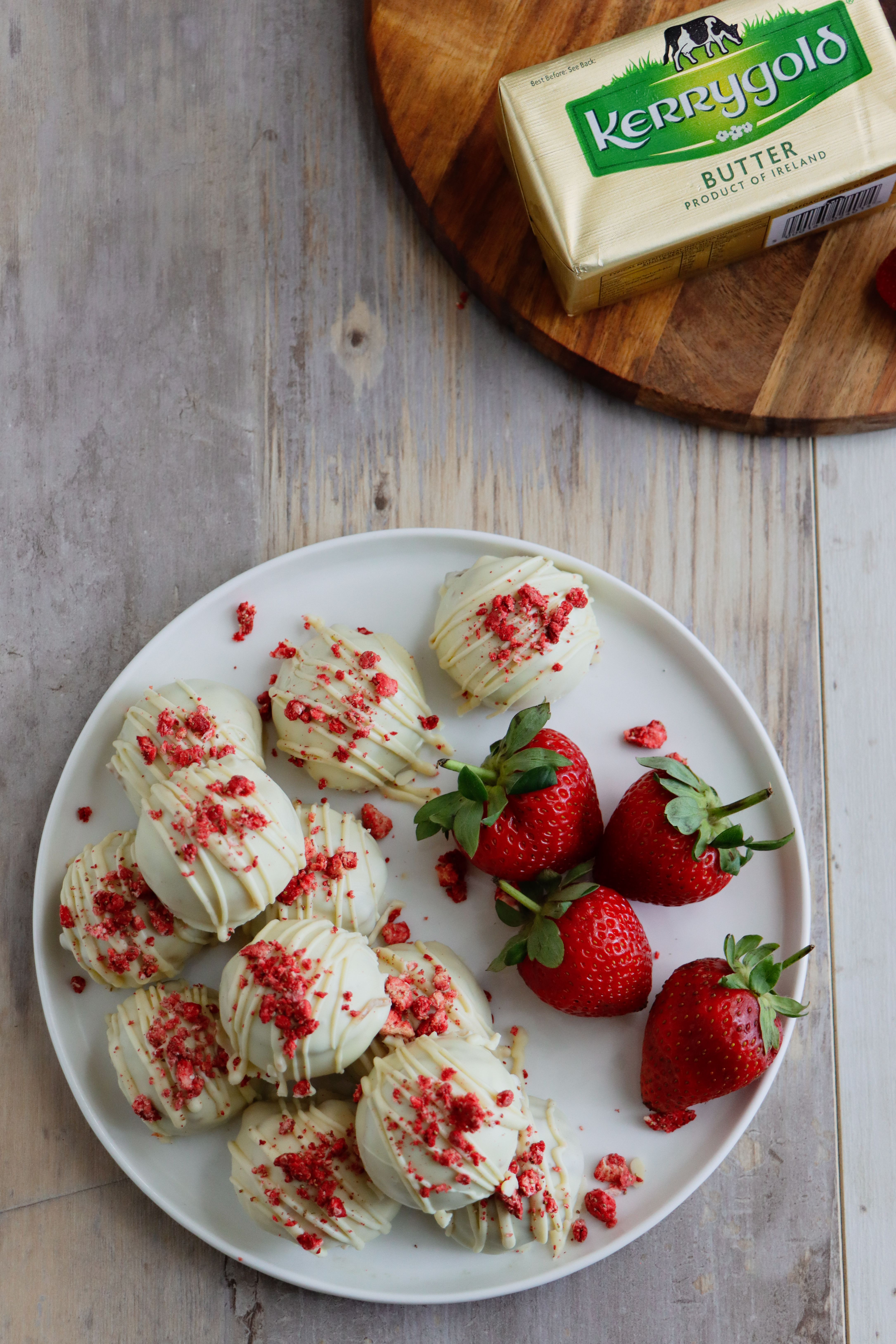 Drizzle any leftover white chocolate over the truffles and sprinkle with freeze-dried strawberries.