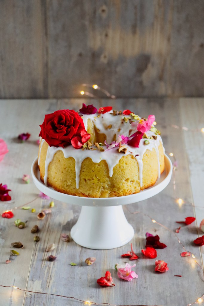 For the glaze, whisk the icing sugar and rosewater together (add a splash of milk if the mixture is too thick) and drizzle over the cake. Decorate the top of with pistachios and edible flowers.