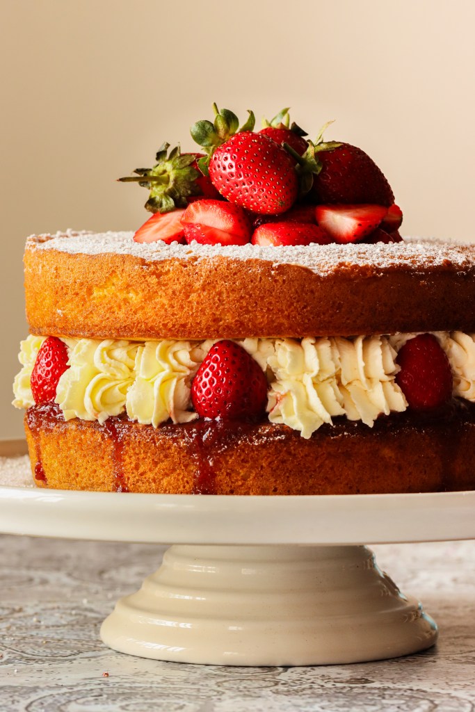 Sandwich the cake with the other half and transfer it carefully to a serving plate. Dust with the icing sugar and spread the remaining cream over and top with whole strawberries and serve.