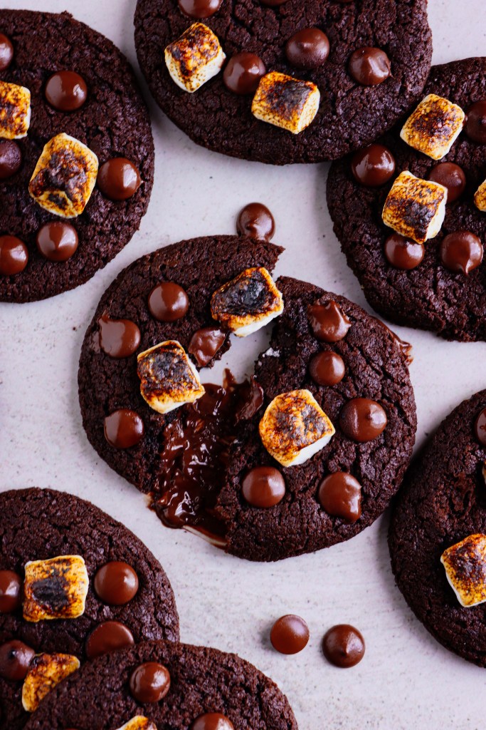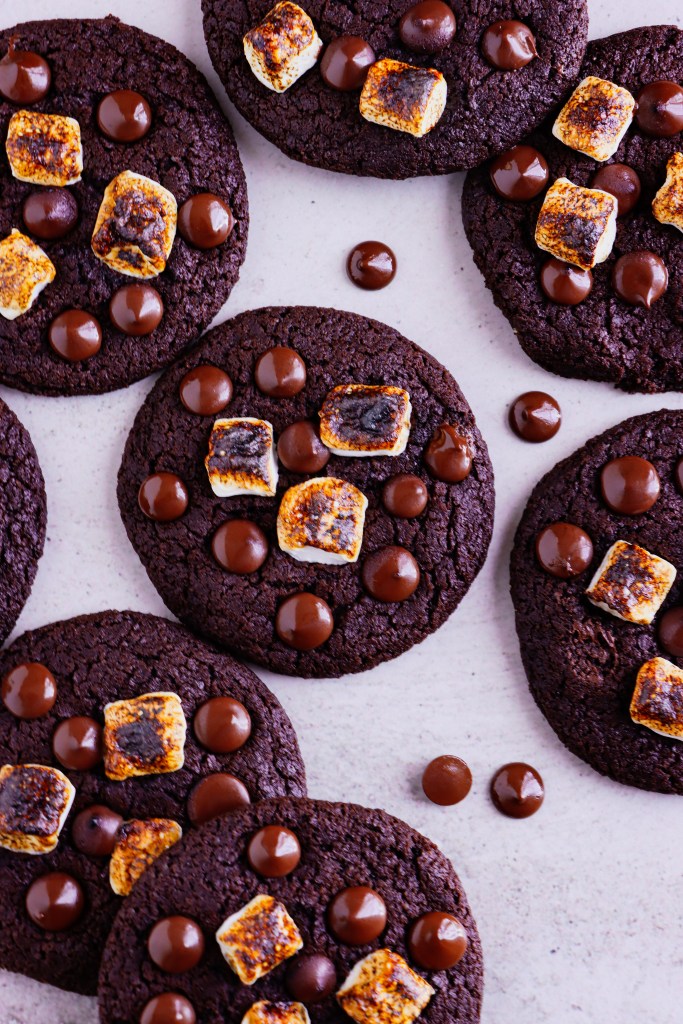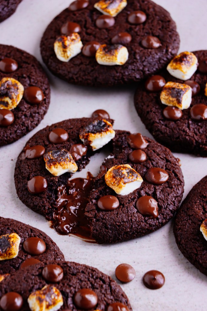 Remove from the oven and add on mini marshmellows and extra chocolate chips.