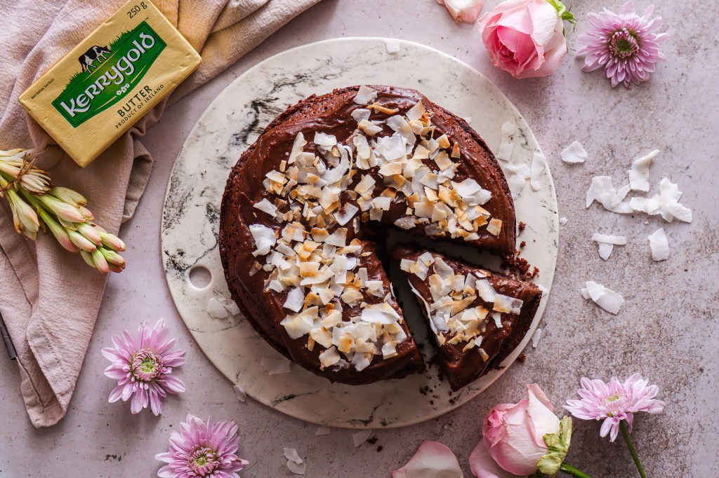This chocolate Macaroon cake is utterly divine – make with Kerrygold butter, roasted almonds, coconut and ALL THE CHOCOLATE!
