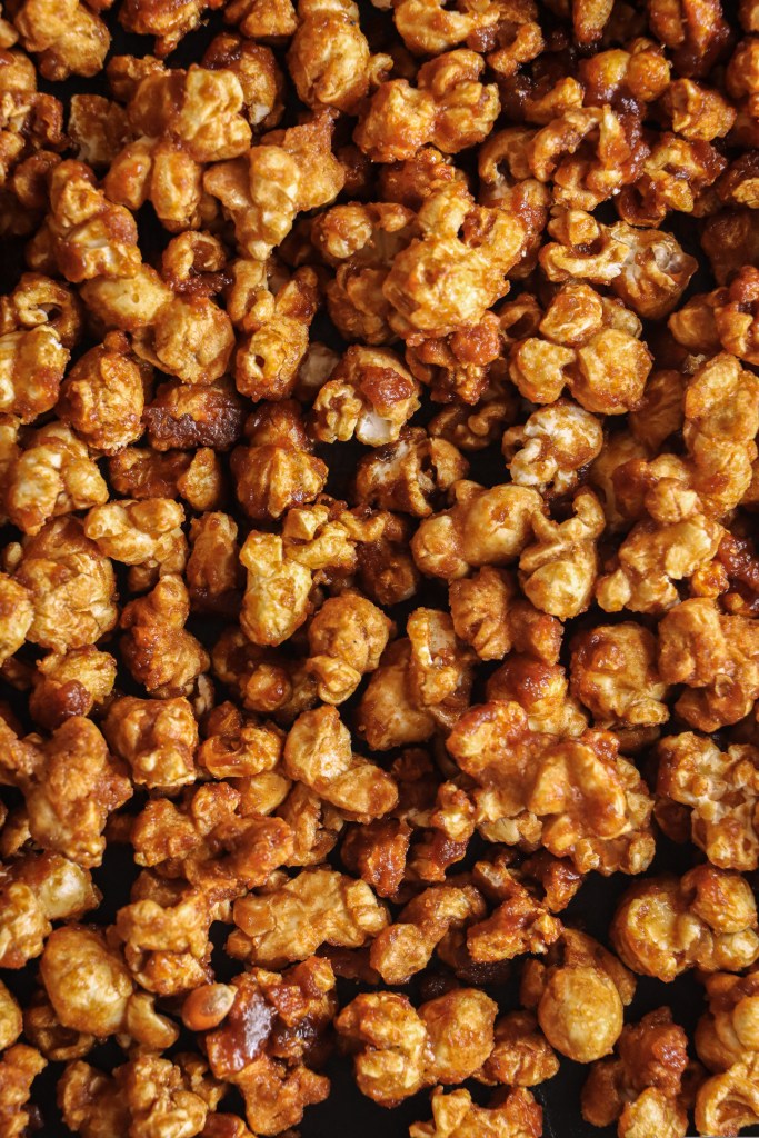 Spread popcorn on 2 baking trays and bake for 45 minutes, tossing every 15 minutes. The caramel will melt during the first few tosses. But will crisp up once cooled.