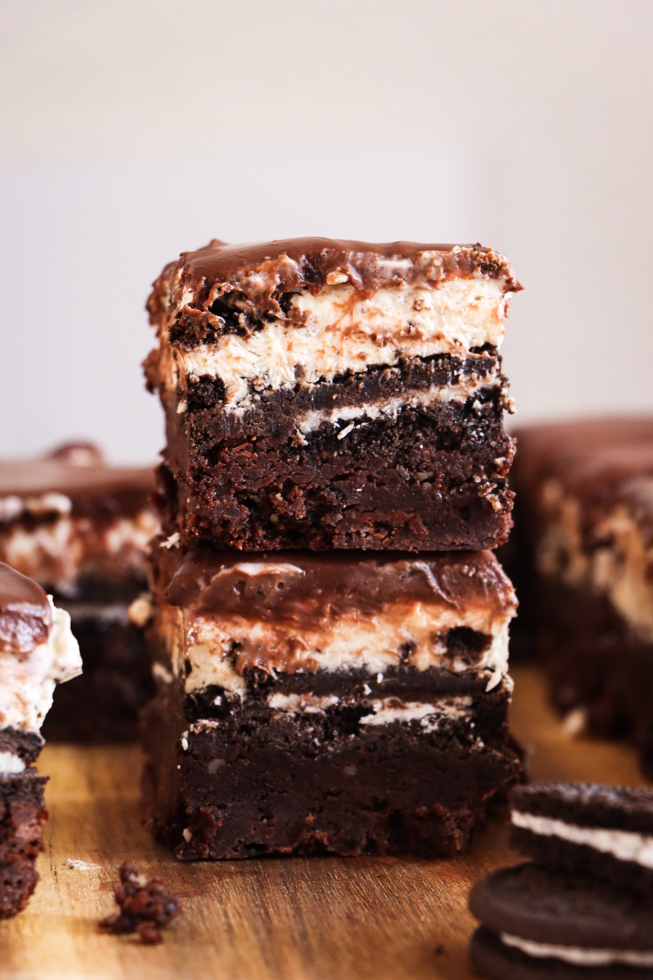 Top the cheesecake filling onto the baked and cooled brownie, and allow to set in the fridge for up to 4 hours.