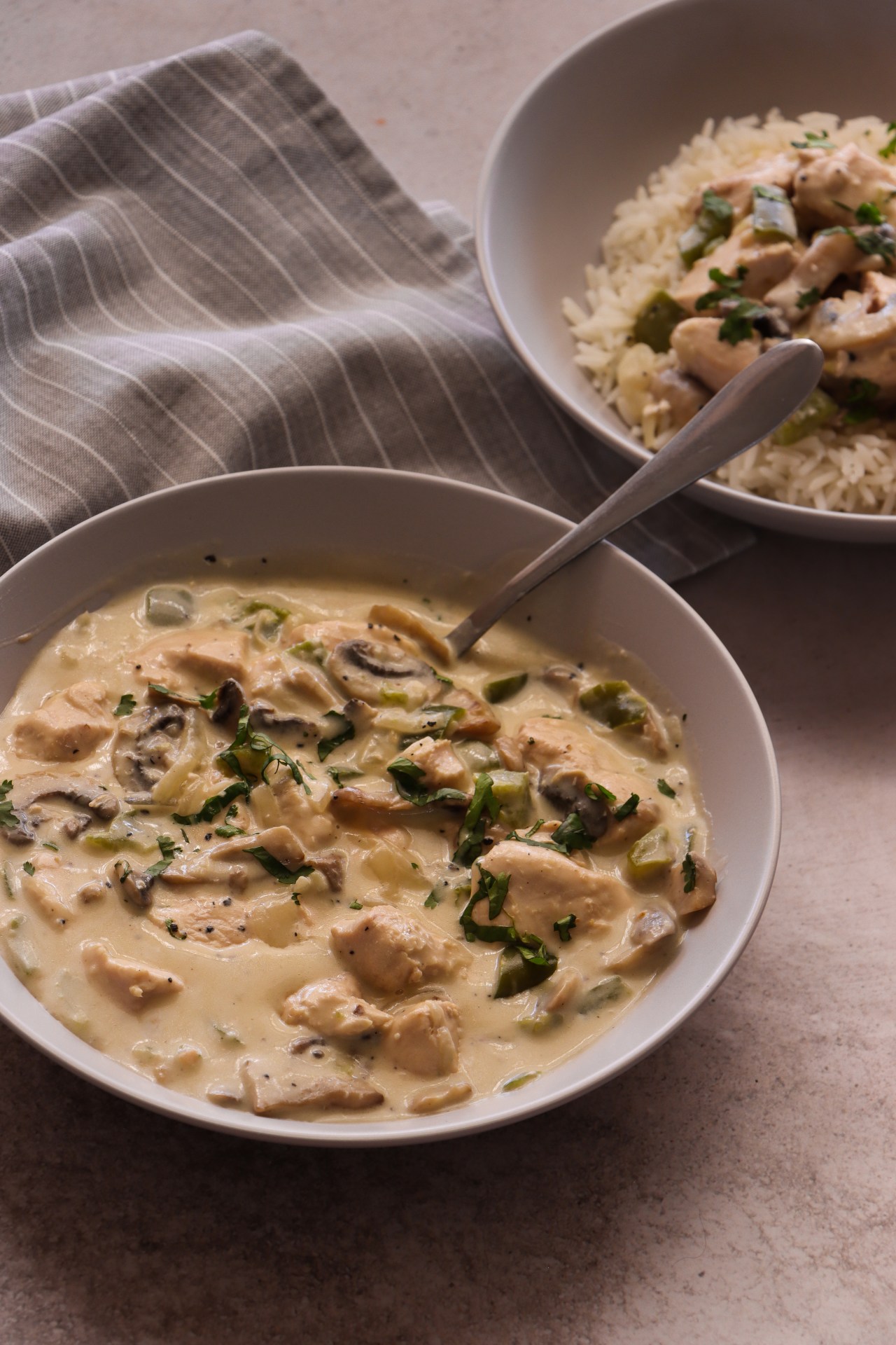 Add the chicken, stock, and cream to the pot and allow to simmer on low heat for about 15-20 minutes, stirring every few minutes, until the sauce thickens.