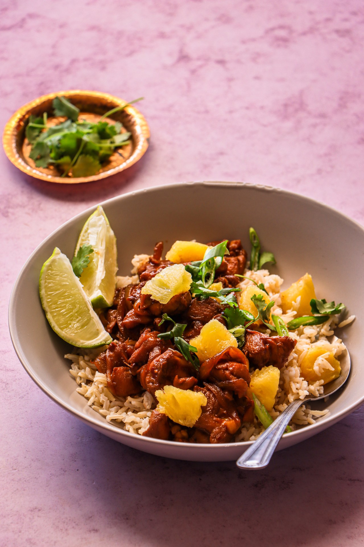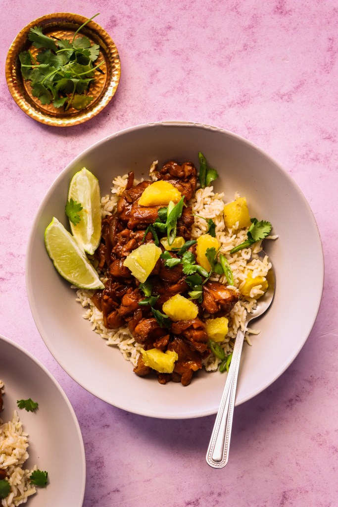 Spoon the chicken and sauce over steamed rice, serve with lime wedges.