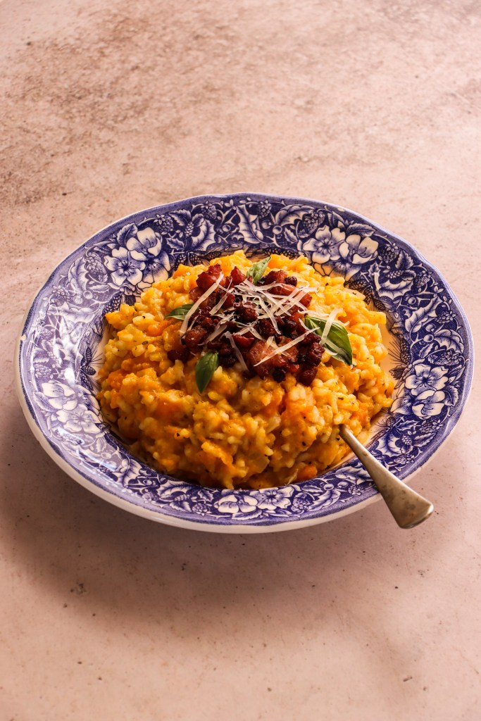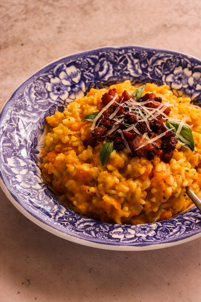 Add in the parmesan cheese and stir until the butternut blends into the risotto.