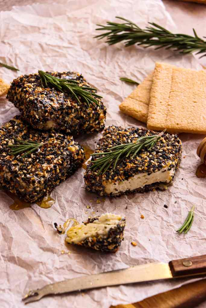 Coat feta with flour on all sides, next dip in the egg mixture, and lastly coat in the bagel sprinkle.