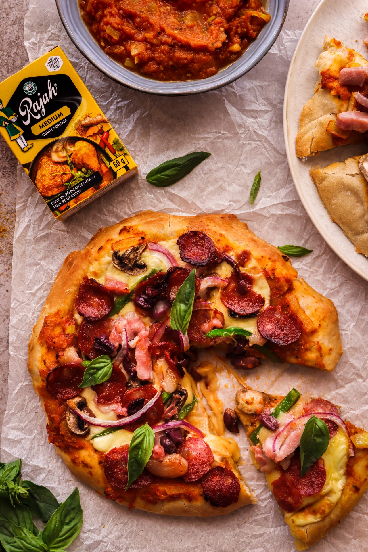 Add tomatoes, Rajah Medium curry powder, oregano, salt, pepper, and sugar. Bring to a gentle simmer.
