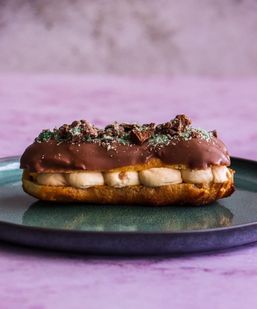 Dip the top half of the eclairs into the melted chocolate, sprinkle with crushed peppermint crisp chocolate and place on a cooling rack and allow to set and enjoy!
