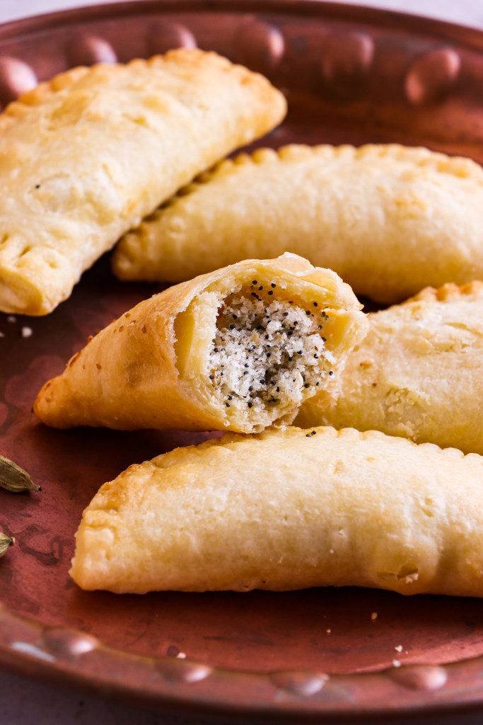 In a saucepan, heat the oil to 180°C. Fry the poli in batches, making sure not to overcrowd the pan, until golden-brown, then place on paper towels to soak up excess oil.