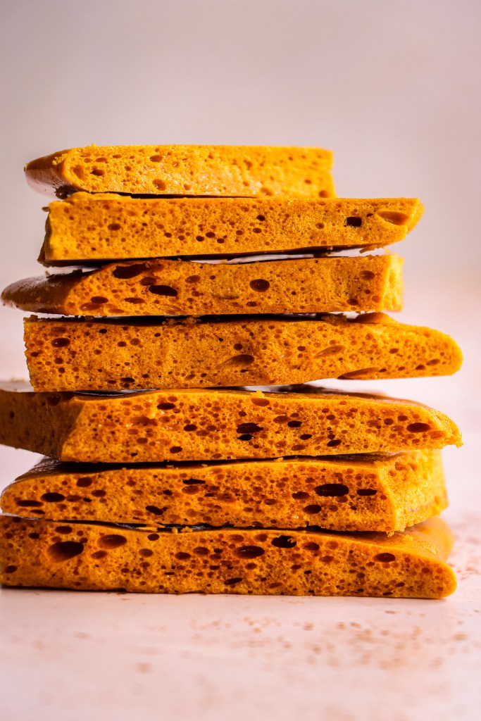 Once set, break into shards and coat in dark chocolate. Allow to set on baking paper and store in an airtight container for up to three days.