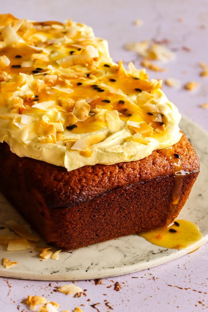 Top the cake with softened mascarpone, drizzle with extra granadilla pulp, and top with toasted coconut flakes and enjoy!