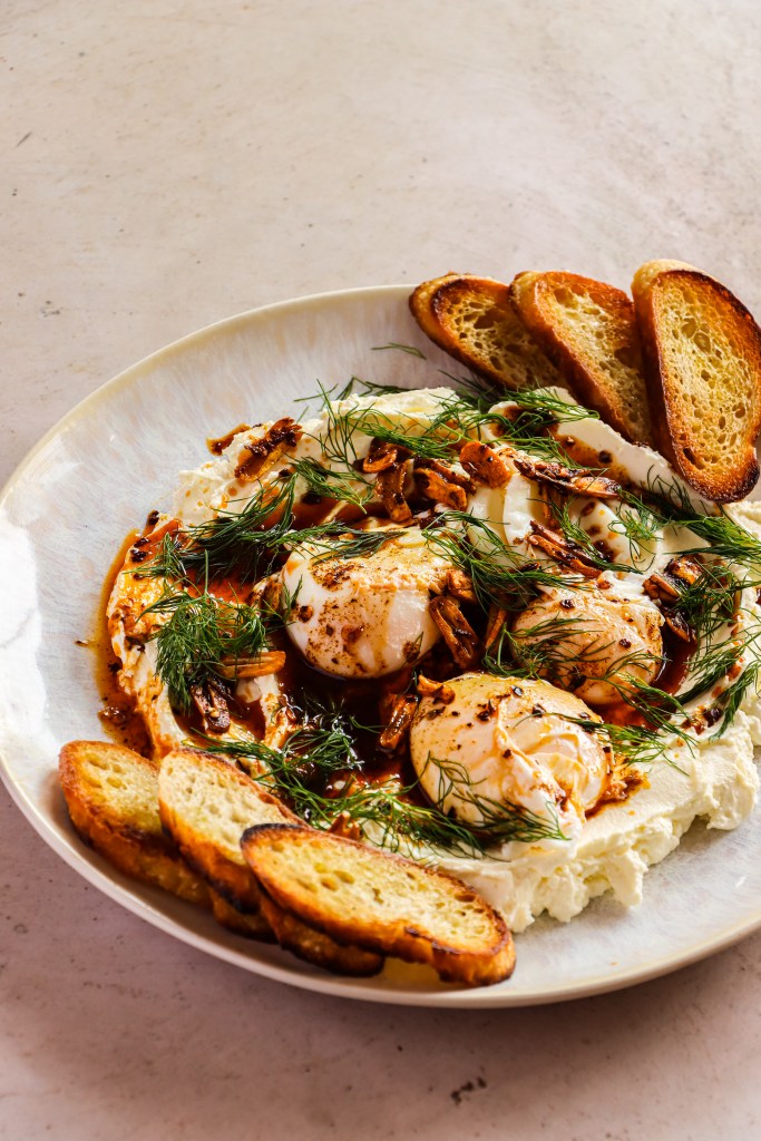 Divide the labneh between 2 plates and spread it into an even layer. Top with poached eggs and a generous drizzle of the delicious spiced garlic butter, top with fresh dill and serve with toasted crusty bread. Enjoy!