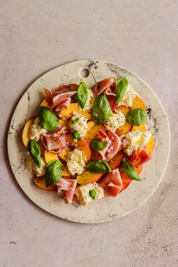 Slice each peach into 8 wedges and arrange them on a platter. Carefully tear the prosciutto and place it over the peaches. Scatter the basil leaves on top.