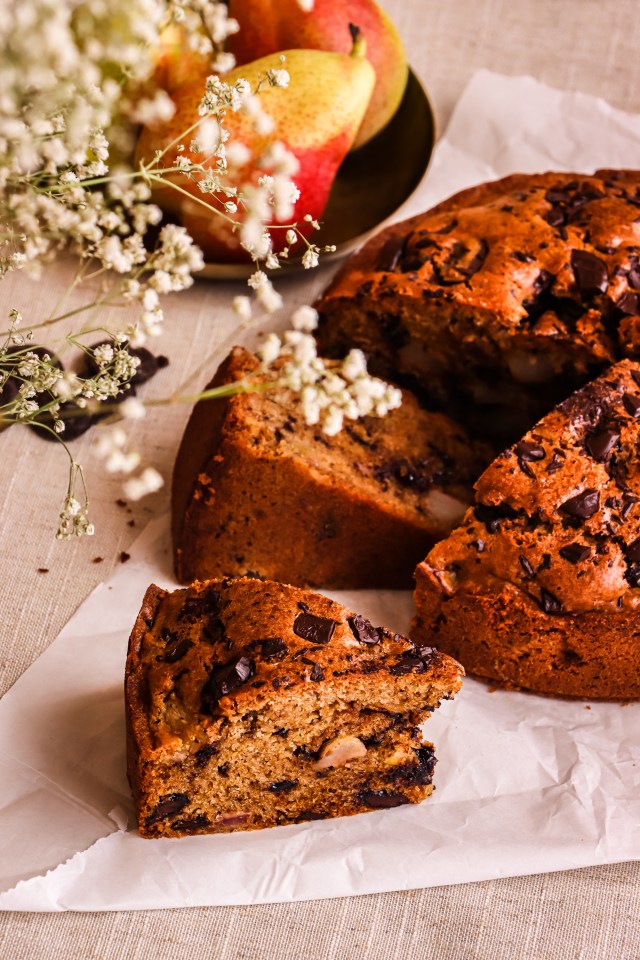 Dark chocolate, pear, and Olive oil cake