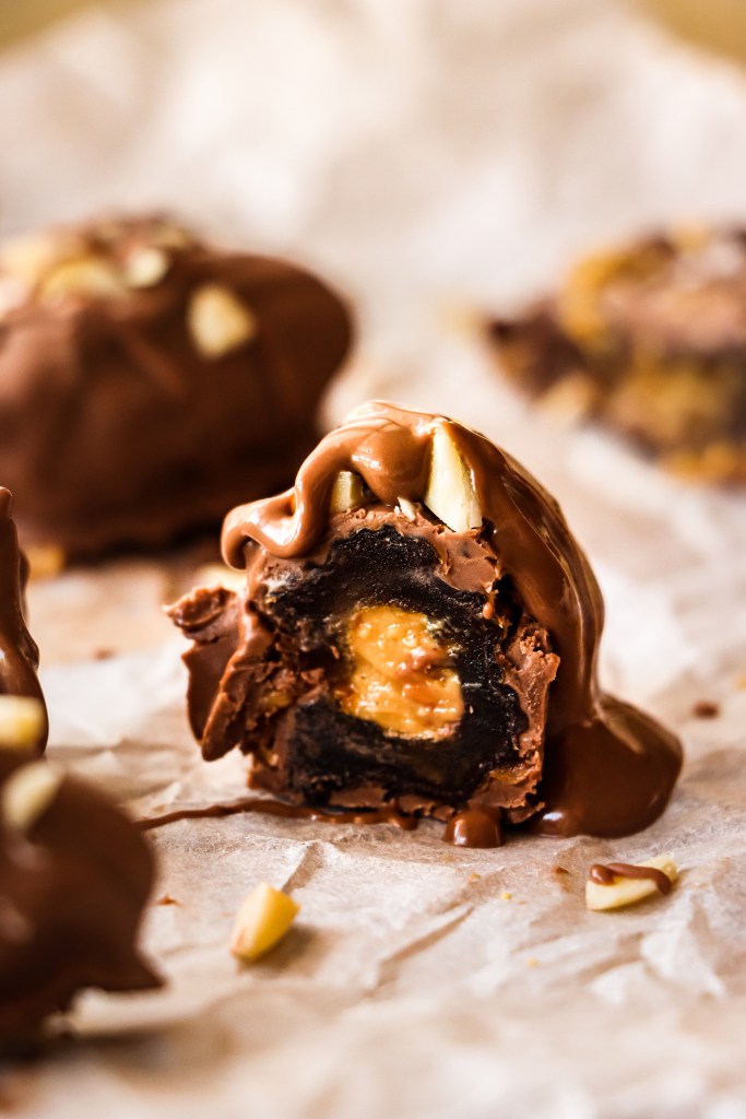 Dip each of the stuffed dates into the melted chocolate. Once coated set aside on baking paper.