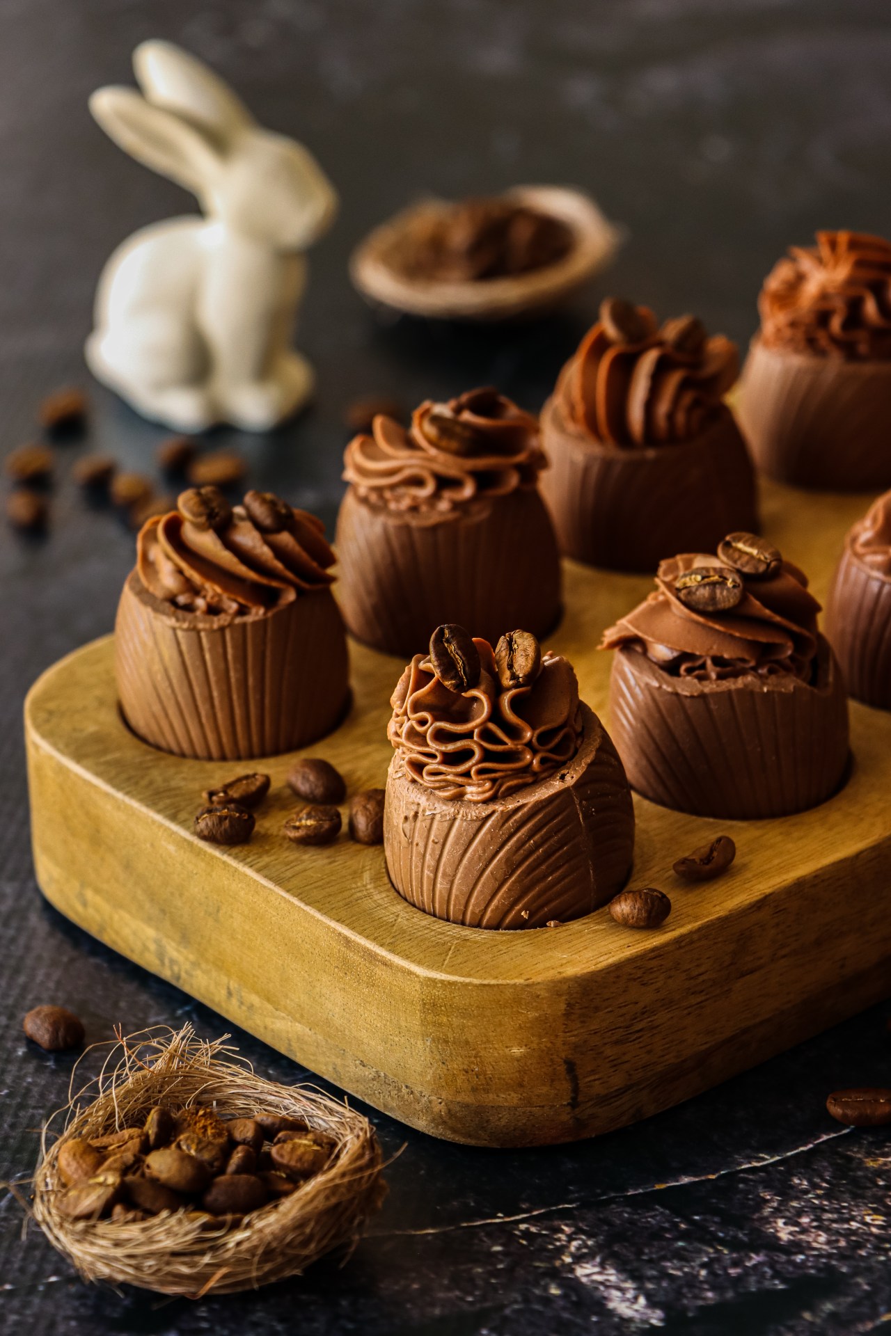 Top each egg with coffee beans or chocolate shavings.