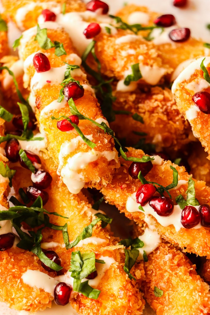 Lastly, dip the halloumi into the breadcrumb mixture until it is well coated. Place halloumi onto a plate and repeat with the rest of the cheese