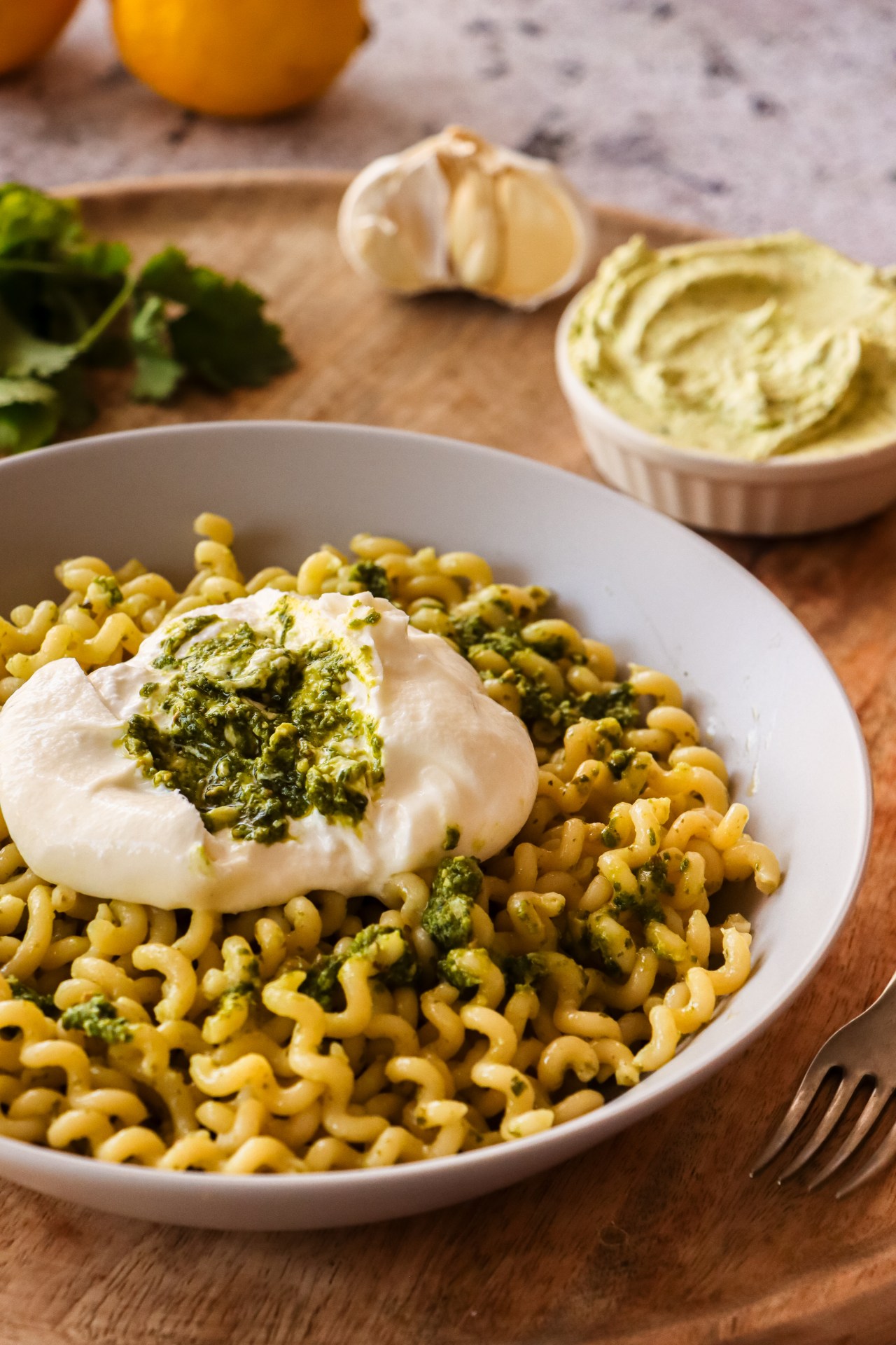 In a large saucepan on medium heat, add 2 heaped tablespoons of the whipped pesto butter (add more if needed). Allow the butter to melt, add in the cooked pasta and as much pasta water as needed.