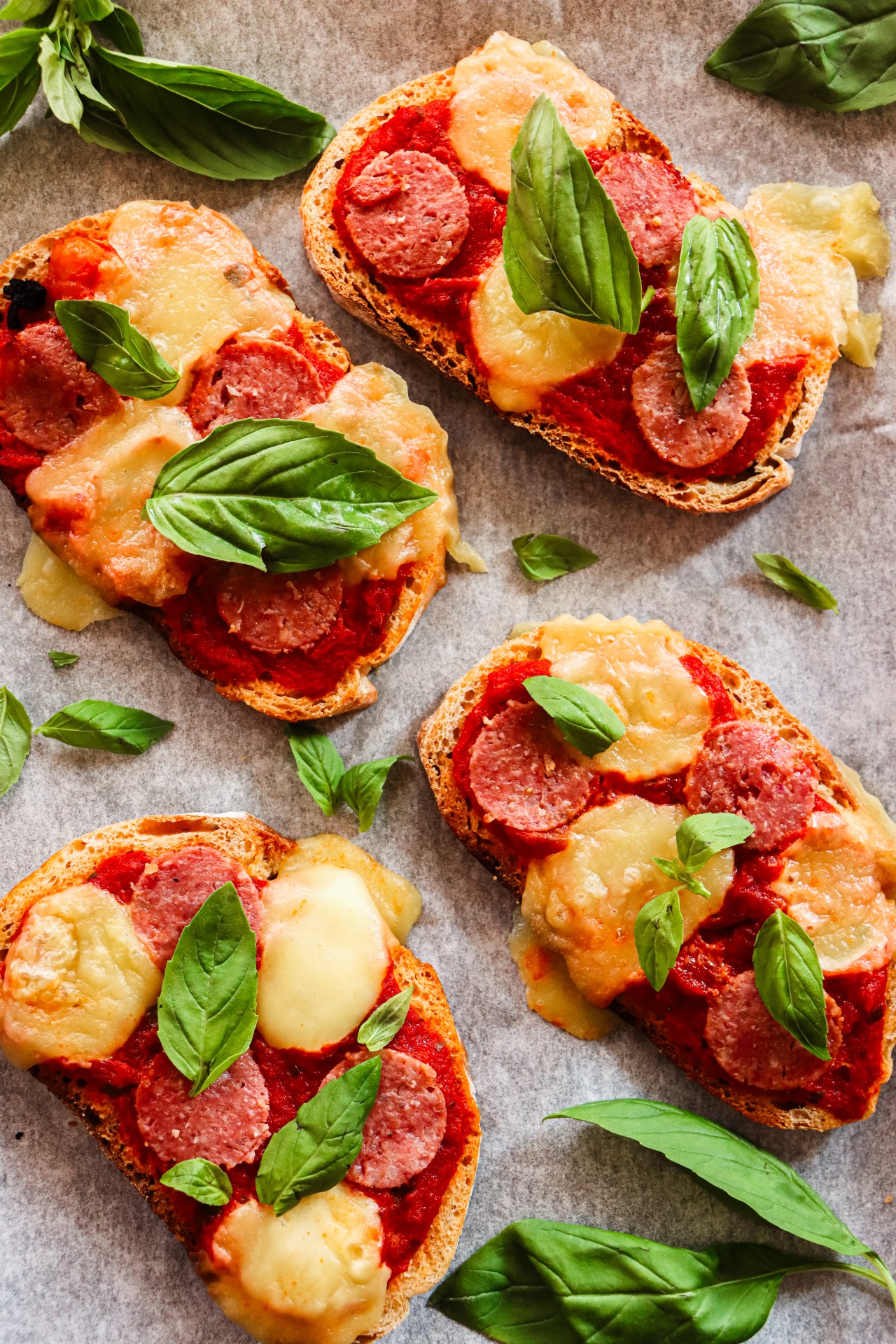 Place the bread on a baking sheet topped with baking paper and add a generous spoonful of pasta sauce on each slice.