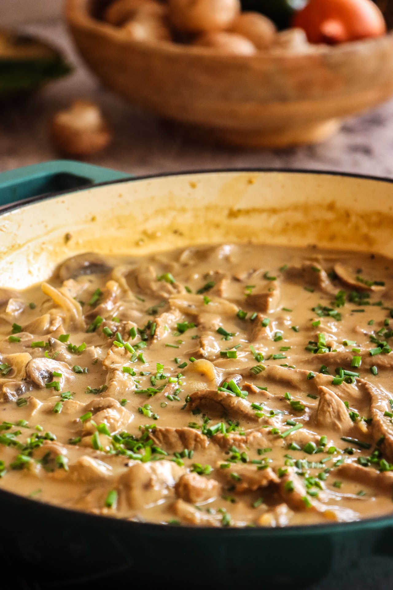 Add the beef stock while stirring. Add in the sour cream and Dijon mustard. Stir until incorporated. Allow to simmer for 5 minutes. (4 – 5 minutes). Season with salt and pepper. Add the beef to the sauce and allow to simmer for 5 minutes. Remove from the heat. Serve over pasta and garnish with chives. Enjoy!