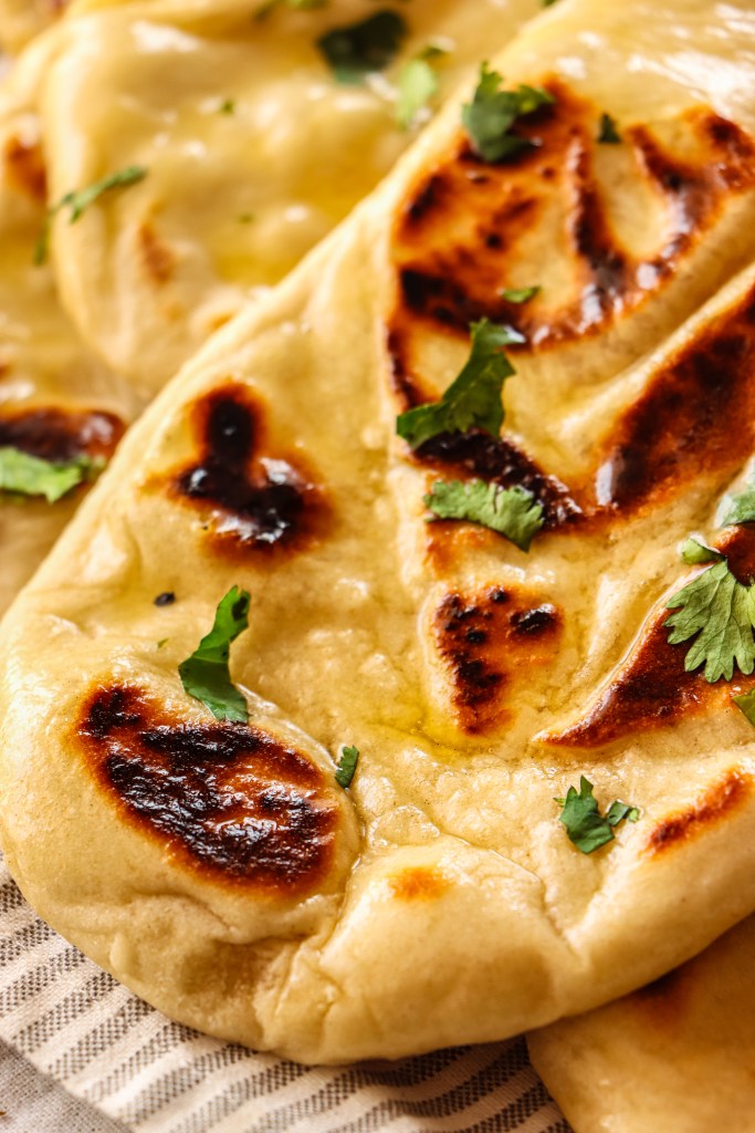 Remove the naan from the pan onto a plate, and brush with melted butter and garnish with fresh coriander, continue this process until all the naan has been cooked.