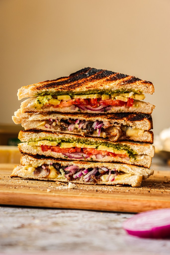 Spread basil pesto on 6 of the slices, add the cheese slices, sliced tomato, and then onion. Sandwich with the remaining slices – butter side up.