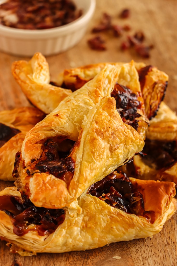 Cut puff pastry into squares, smear on onion chutney, and add a slice of brie, and a portion of the biltong.