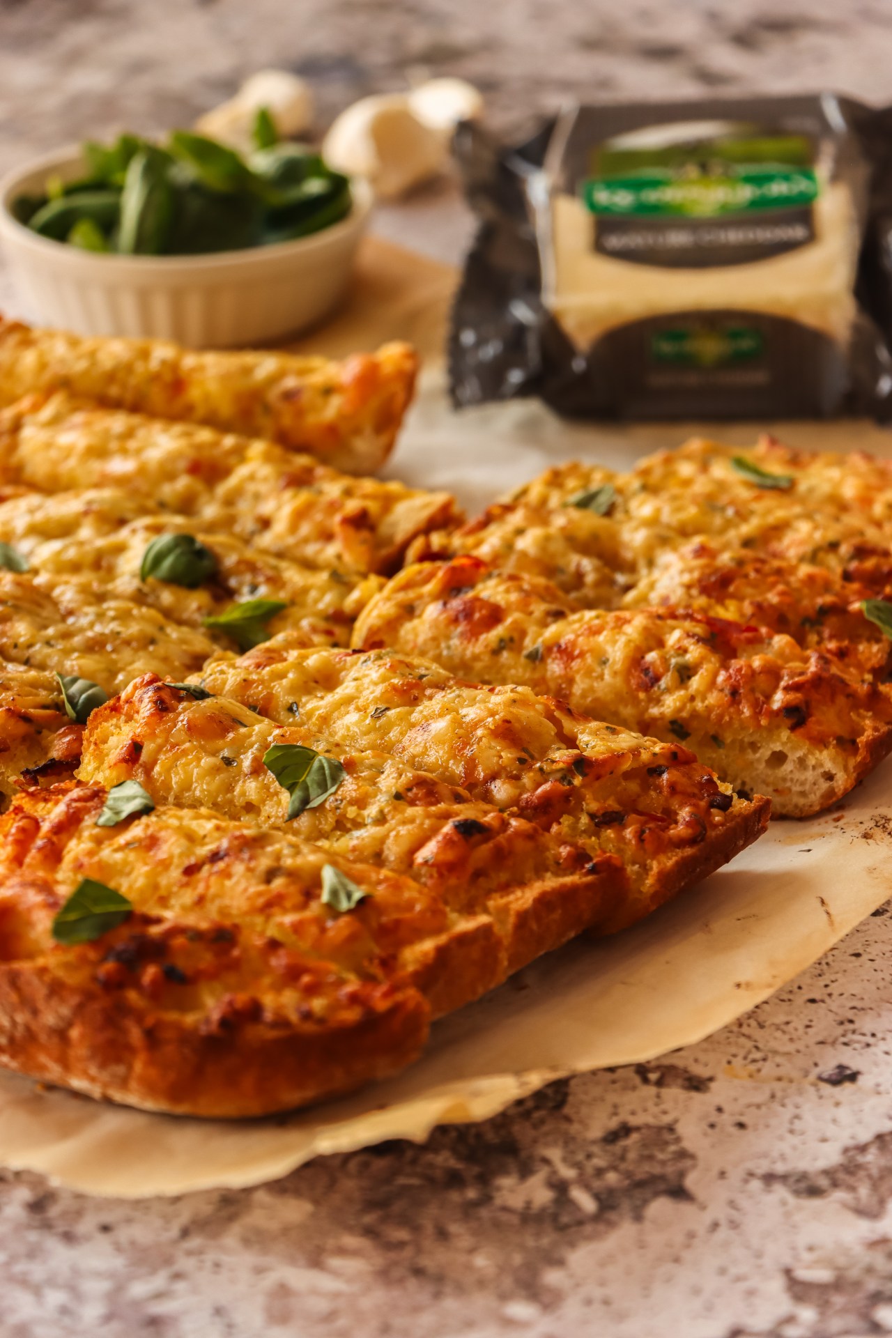 Slice the ciabatta in half lengthwise and place cut side up on the baking sheet.