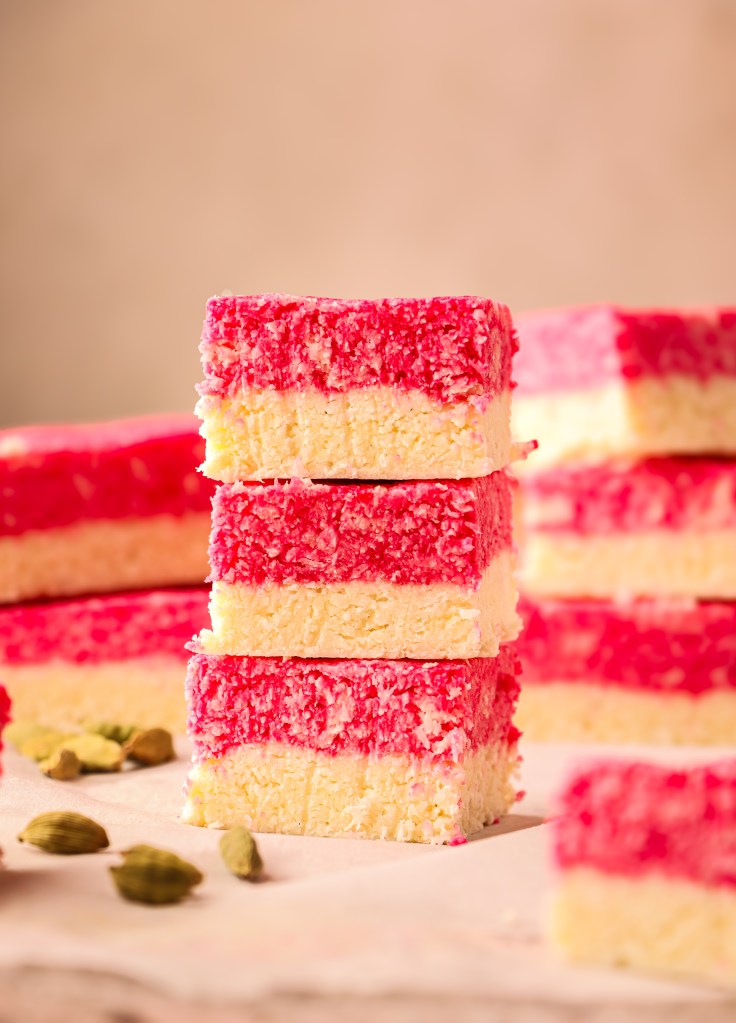 To the remaining coconut ice mixture, add pink food colouring, and rose syrup, and mix till combined. Add this mixture to the baking dish and use a spatula to smooth out and flatten the mixture.