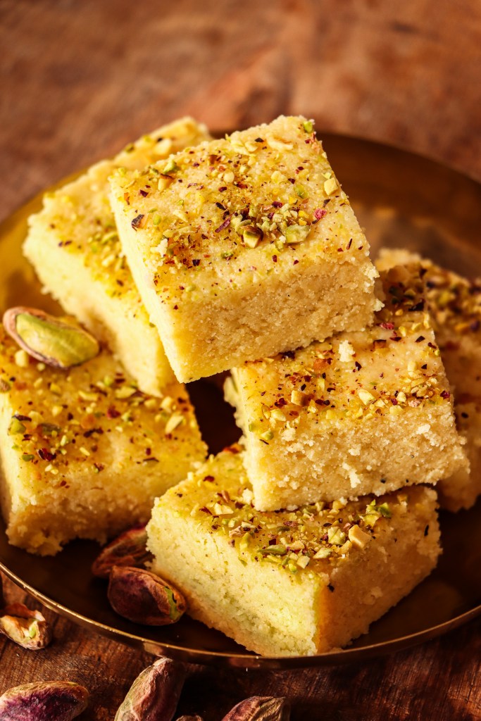 To make the syrup add milk, ghee, and icing sugar to a saucepan and bring to a gentle simmer for 3 – 4 minutes until all the sugar has dissolved, remove from the heat.