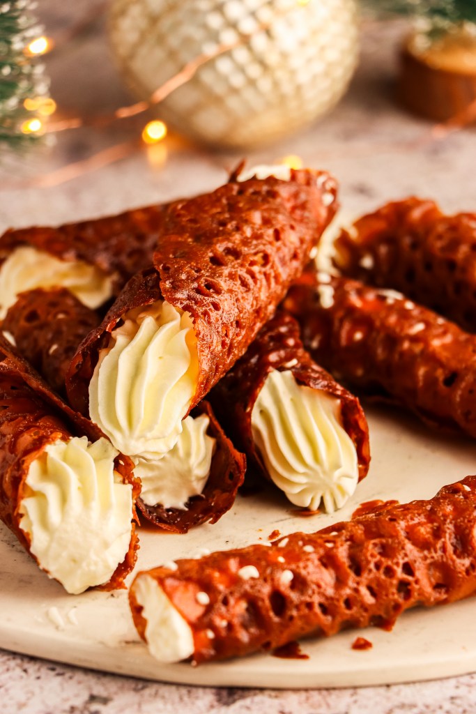 To make the filling, add the chilled cream and sugar to a mixing bowl and whip until thick. Add whipped cream to a piping bag and fill the brandy snap biscuits just before serving. Enjoy!