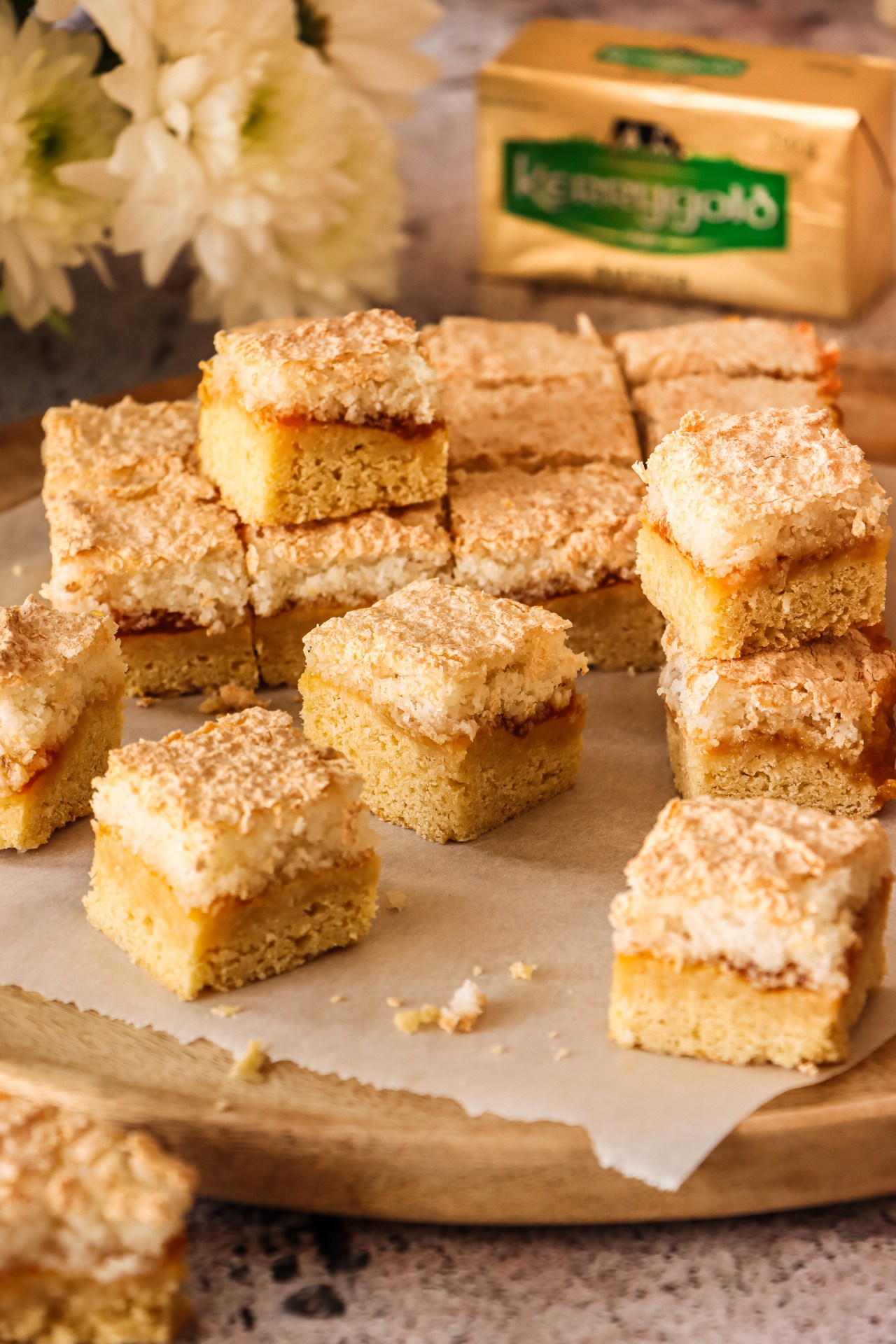 Preheat the oven to 170° C. Remove the dough from the refrigerator and spread with the apricot jam. Gently spread the coconut meringue on top of the apricot jam layer. Bake for about 30-35 minutes until the coconut meringue is golden. Allow to cool in the tray for 30 minutes. Slice into bars and enjoy!