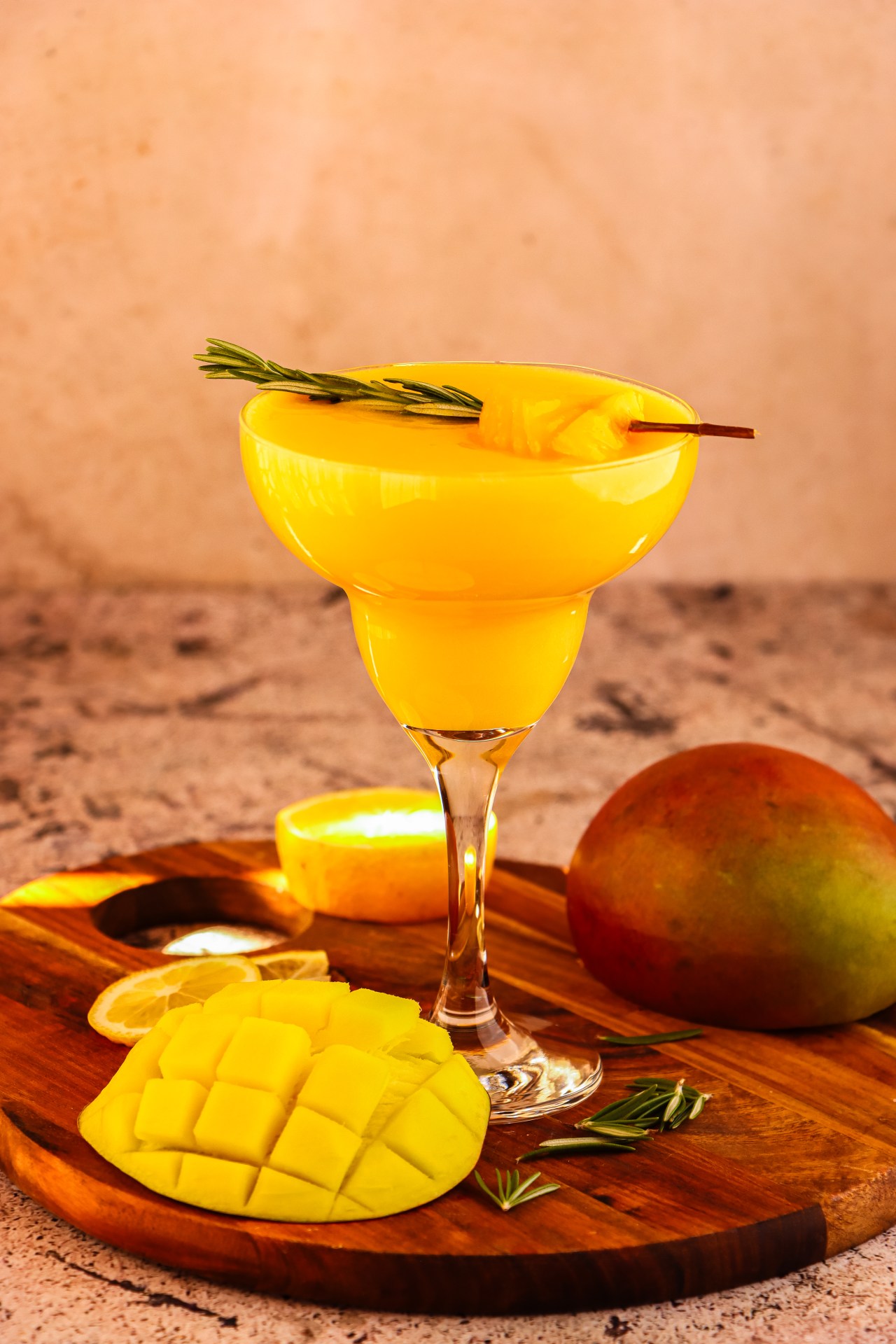 Pour into a glass and garnish with fresh mango and lime. Enjoy!