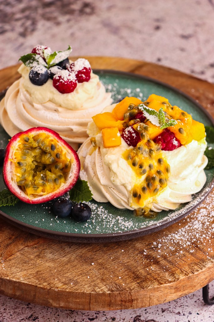 Serve the pavlovas with a big dollop of cream, top with fresh fruit, garnish with sprigs of mint, and dust with icing sugar. Serve immediately.